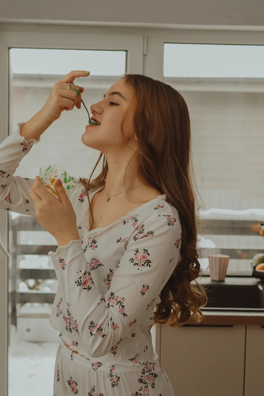 пирсинг, Выразительные карие глаза, пухлые губы, активная мимика, длинные прямые волосы, щербинка в зубах. Из пирсинга - проколы в ушах, по одному.