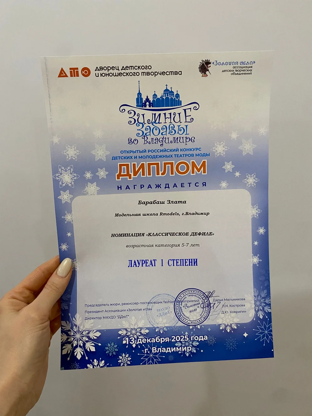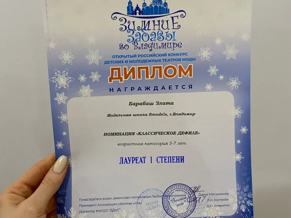 Участвовали в российском конкурсе Золотая игла номинация "классическое дефиле" - лауреат 1 степени в возрастной категории 5-7 лет. (2025 год)