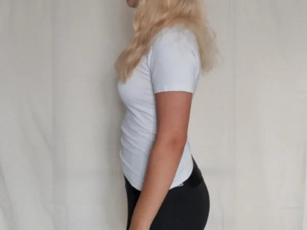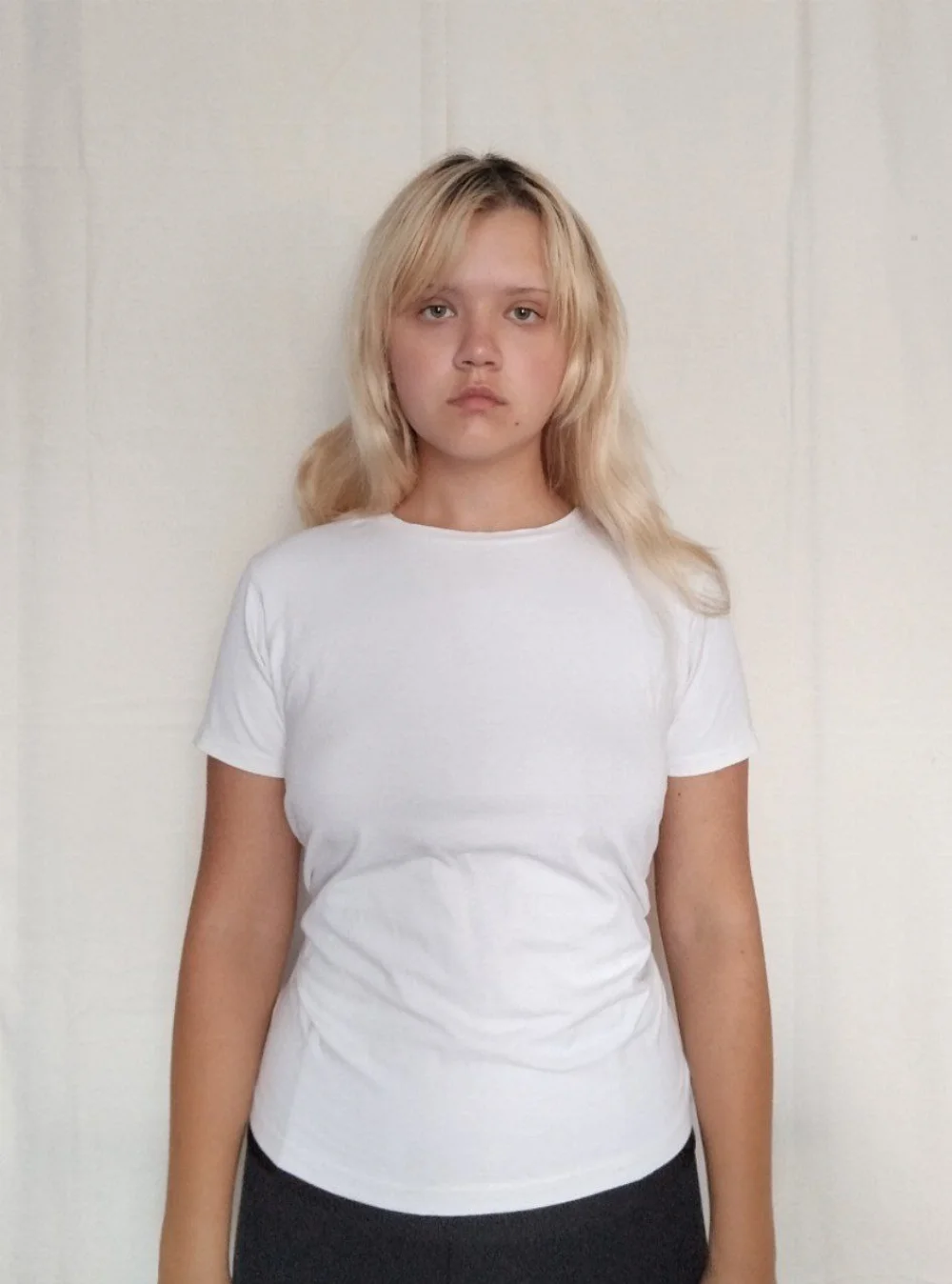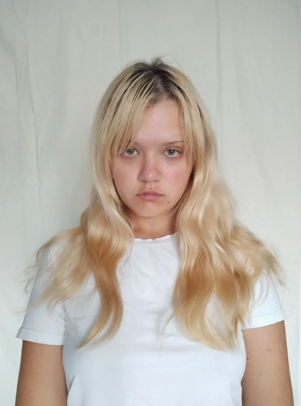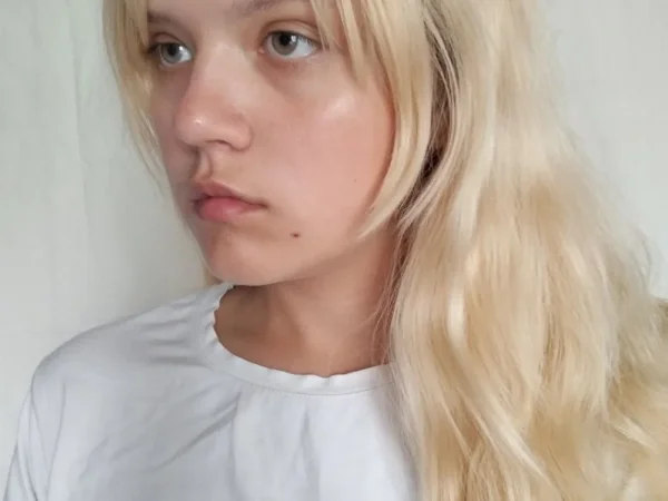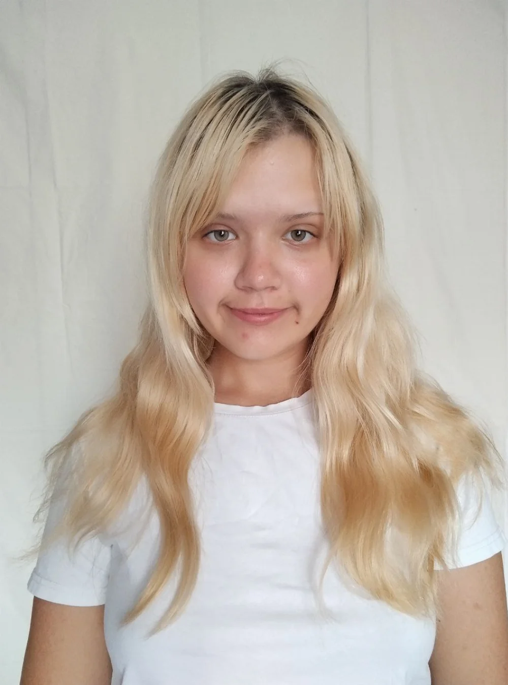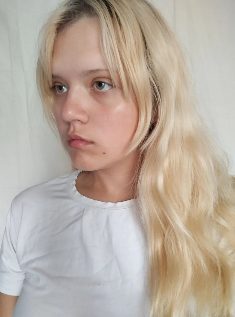 волосы крашенные, широкие плечи(93 см), мягкие черты лица