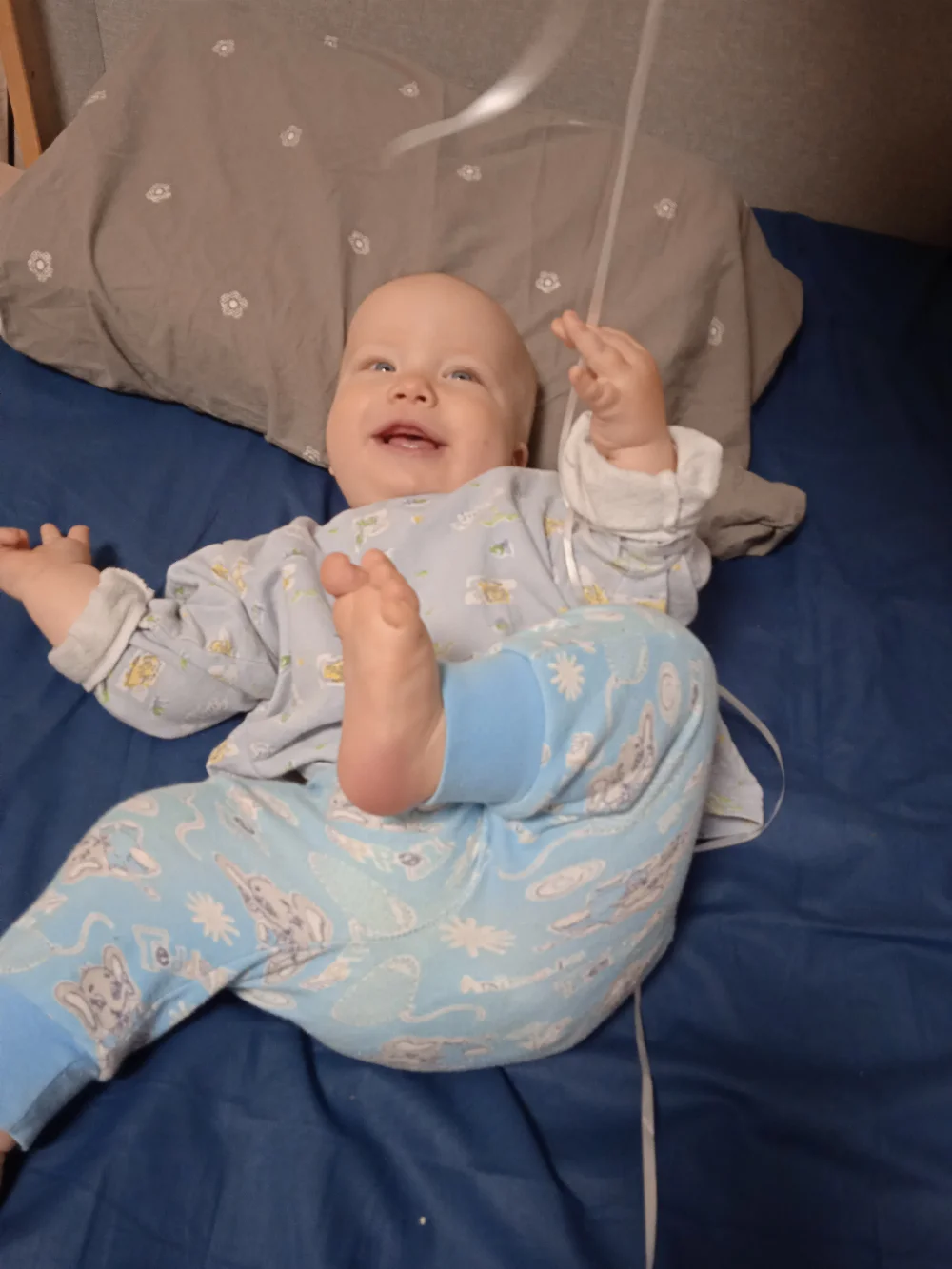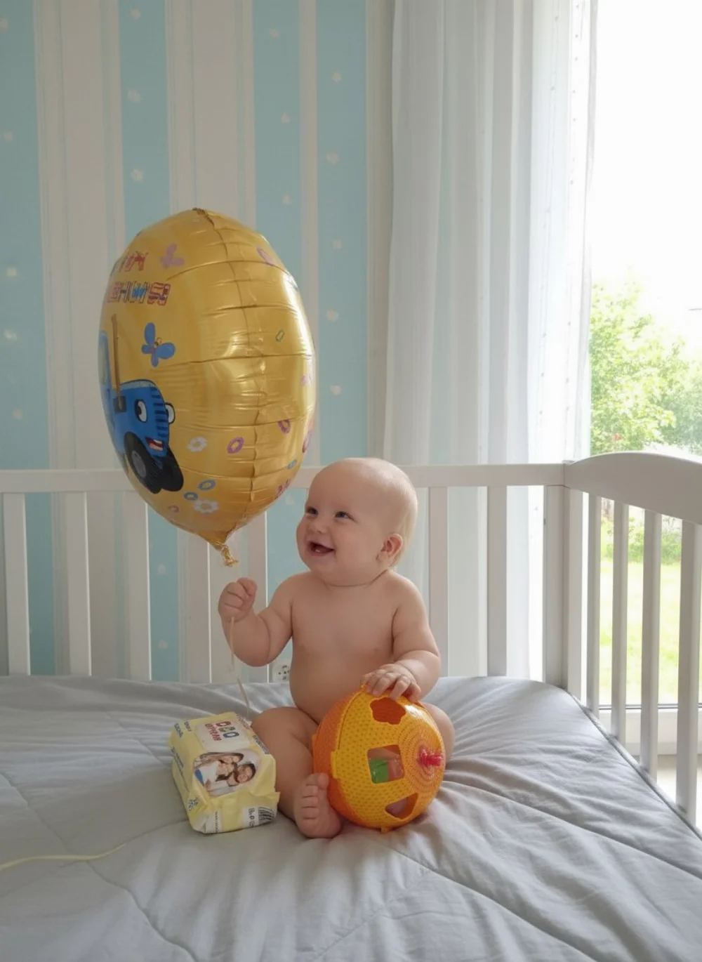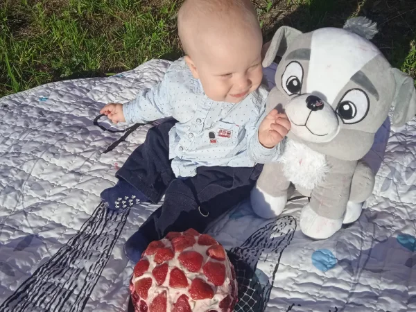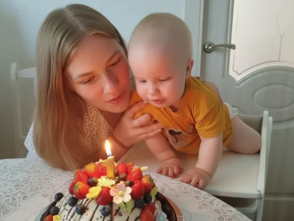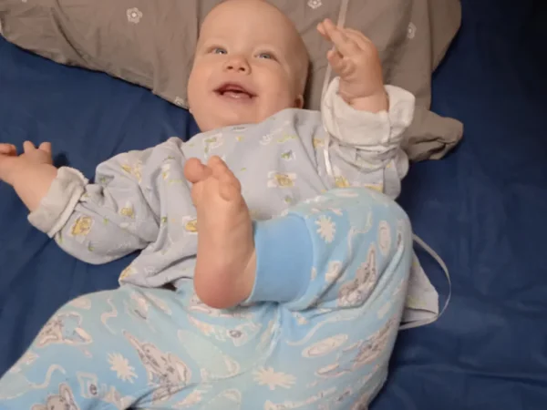 Милый, красивый малыш с ярко голубыми глазами и светлыми волосами. Очень улыбчивый