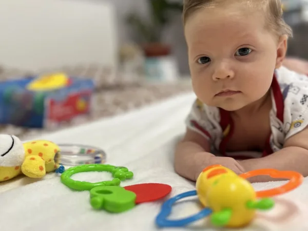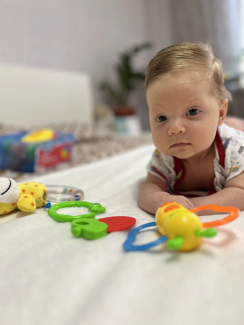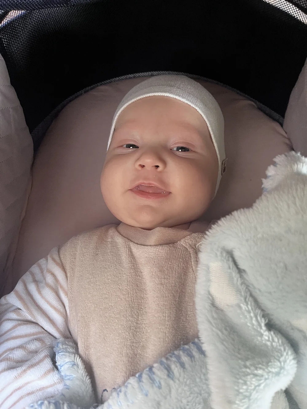 Его тело уже стало более послушным: он переворачивается со спинки на бок и живот. В эти моменты его белокурая головка и ясные глазки делают его похожим на цыплёнка, который выглянул из гнезда.