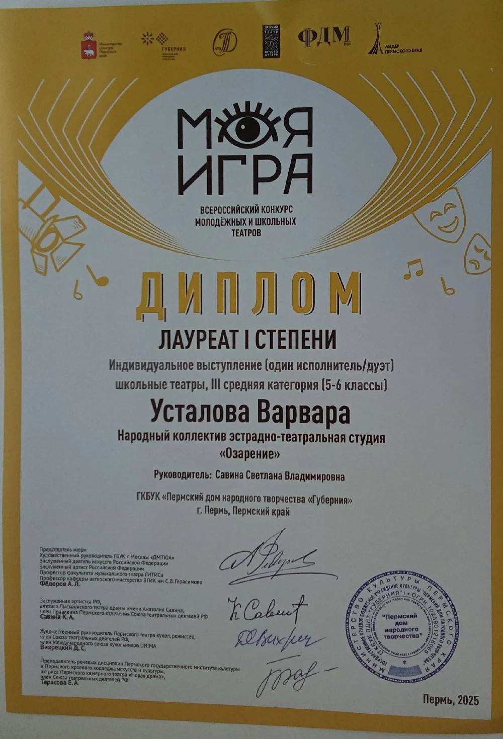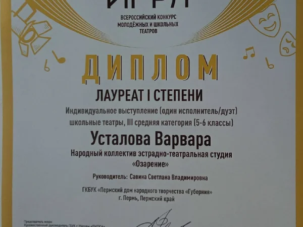 лауреат 1 степени на Всероссийский конкурс молодёжных и школьных театров моя игра 2025