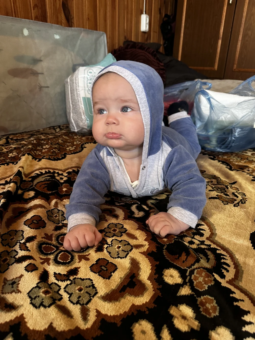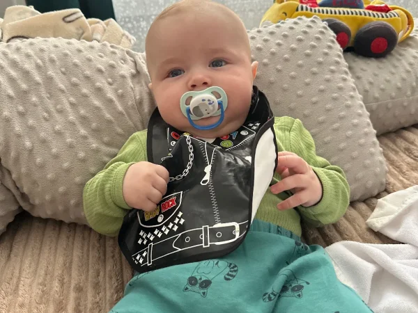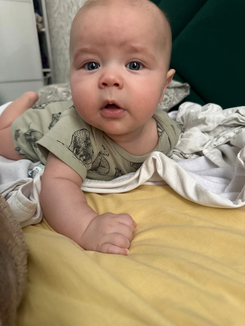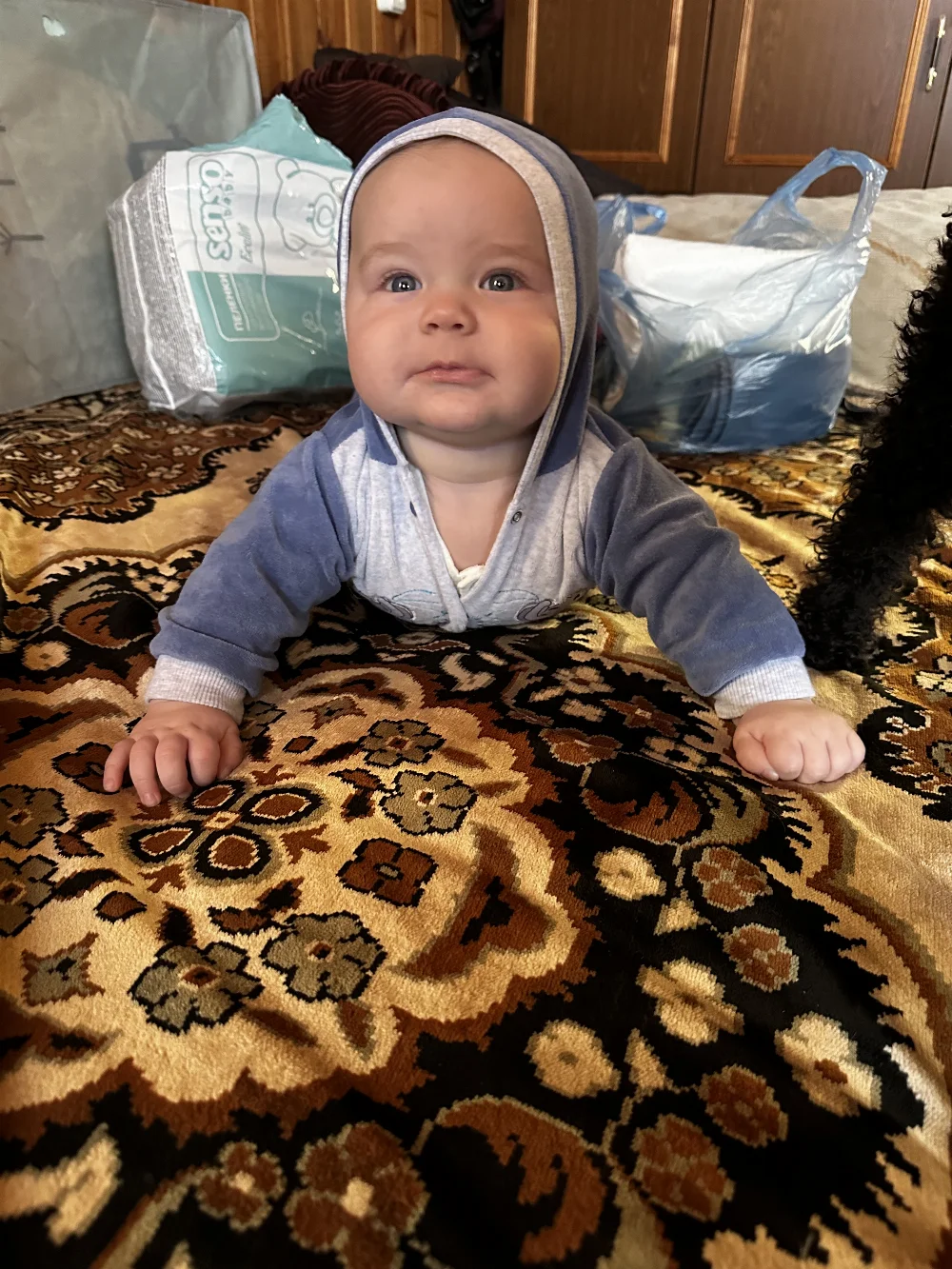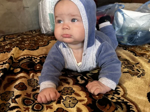 Очень веселый, улыбчивый, подвижный малыш. Не боится чужих людей, живые эмоции.
